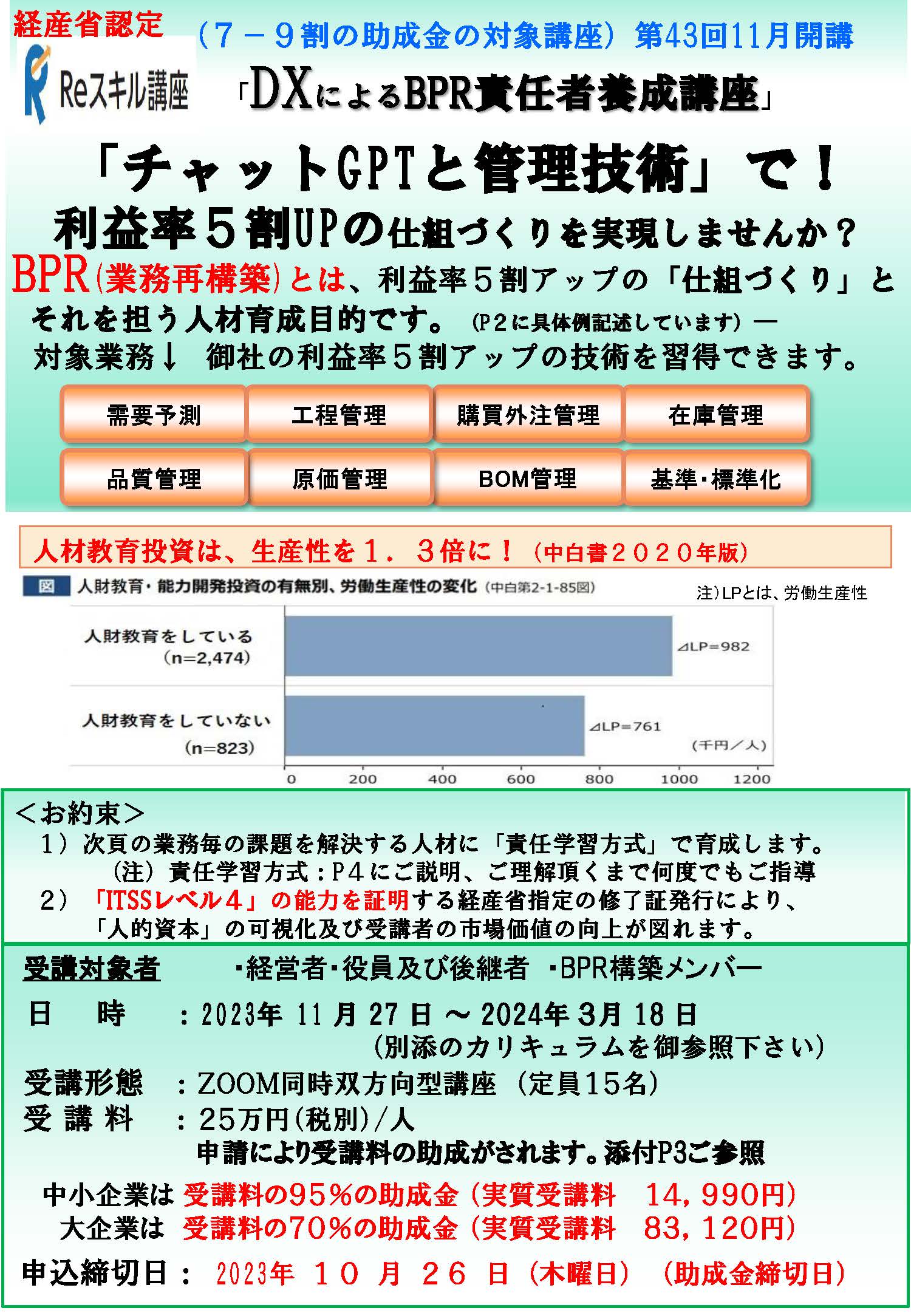 「経産省認定講座」の特典と、今回からはチャットGPTを使用したBPR構築を習得できます。
